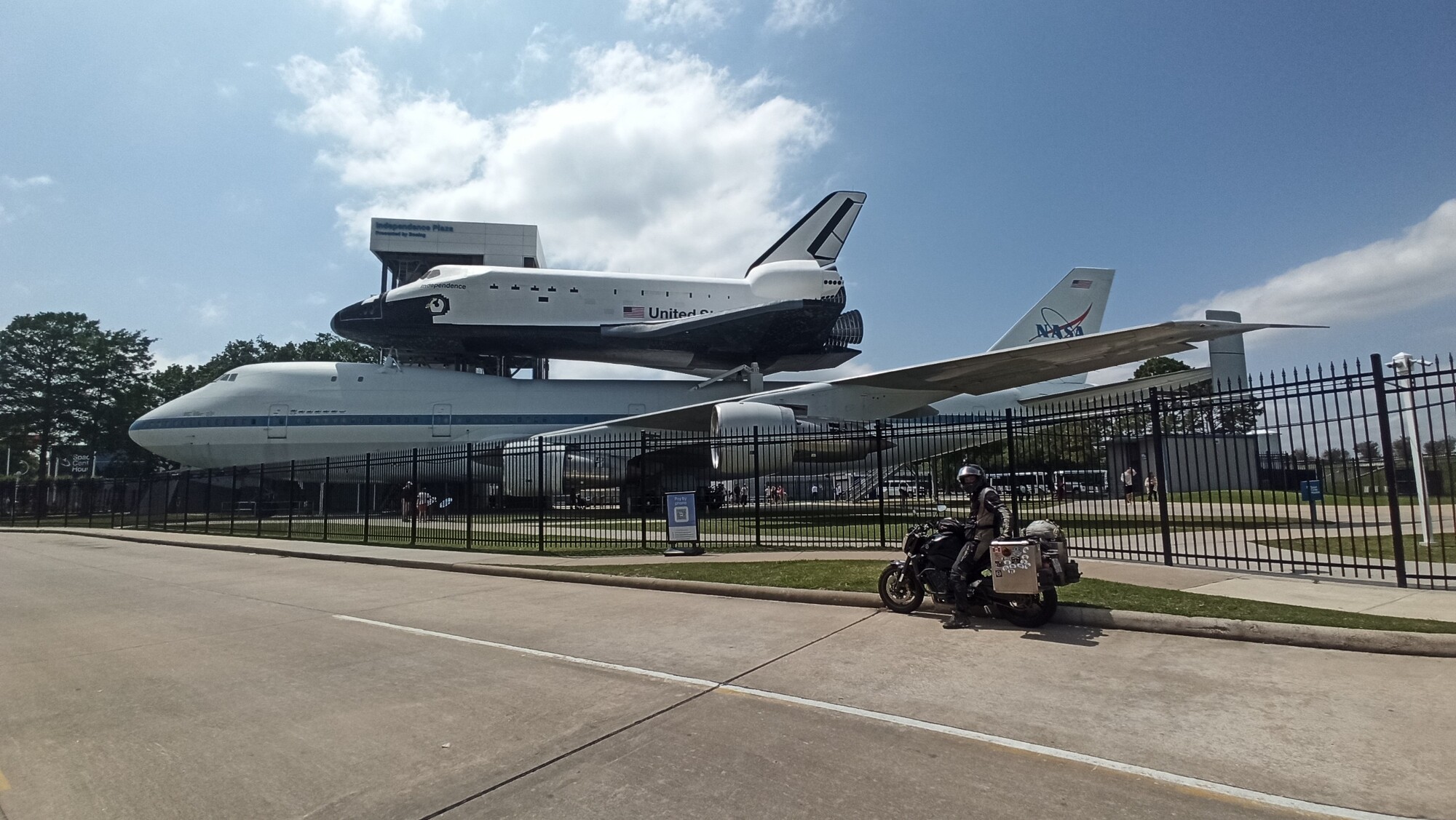 Niki a Boris na potulkách motorkou. Na fotke je Houston Space center v Texase.
